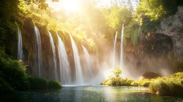 Exotic Waterfall and Lake Landscape of Plitvice Lakes National Park: A stunning view of the waterfalls and lakes in Plitvice Lakes National Park, Croatia, known for its cascading waters and lush