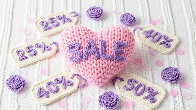 Valentines day crochet hearts decoration with tools on coral backdrop. Perfect for greeting cards retail marketing craft store advertising social media content festive seasonal sales promotion