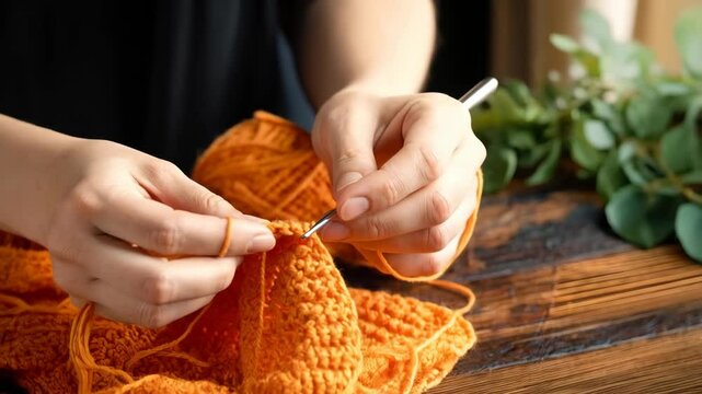 Close up of hands knitting an orange yarn with a hook on a wood table in a crafting session.