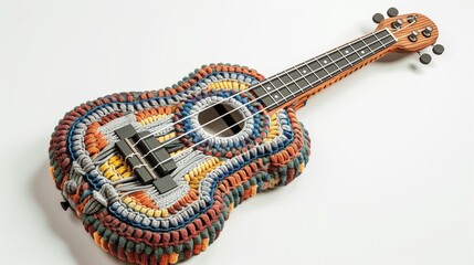 Detailed knitted guitar showcasing musical theme, presented on white.