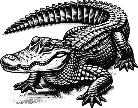 A detailed black and white line drawing of a powerful crocodile with textured skin and sharp teeth