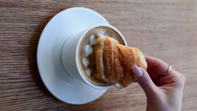 woman in french pastry cafe eating croissant and drinking cappuccino. girl digging desert in latte coffee.vertical video with tasty desert.heart shape from foam. valentines day
