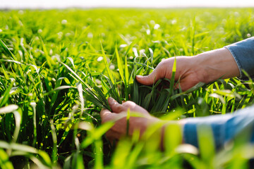 Young Green wheat seedlings in the hands of a farmer. Ripening ears of wheat field. Checking wheat field progress.The concept of the agricultural business.