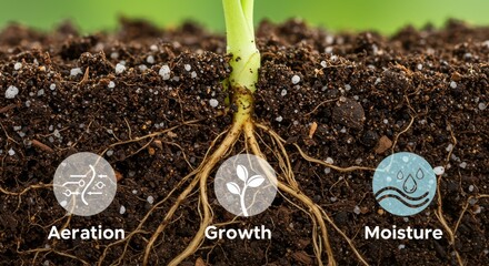 Detailed underground root structure and soil aeration moisture for agricultural growth and natural sustainability, emphasizing nutrient flow and crop health