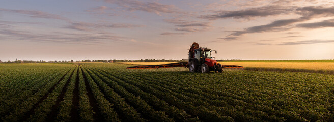 Tractor spraying soybean crops field