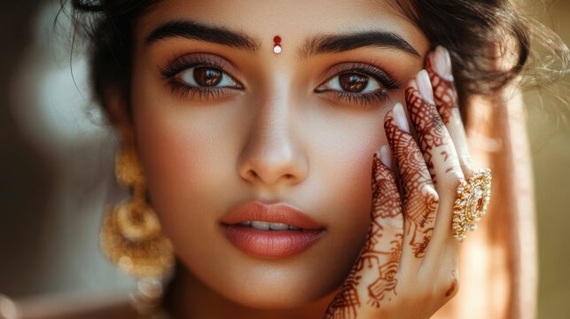 Beautiful indian girl with perfect skin touching face, crop