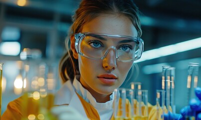 crop concentrated female chemist in protective uniform, gloves and goggles checking test tube during experiment in modern laboratory