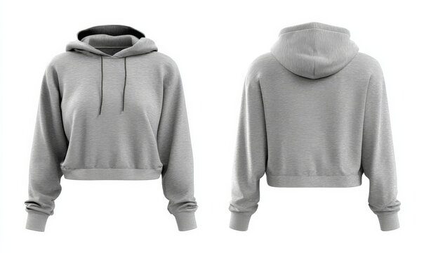 A gray cropped hoodie with long sleeves and a hood, displayed from both front and back views. The casual garment is made of soft fabric for a comfortable fit.