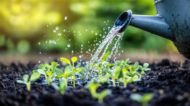 A watering can pouring water onto fresh green sprouts, symbolizing care and agricultural growth, blurred background,