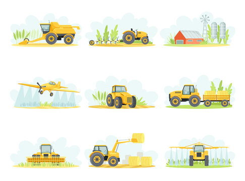 Agricultural farming machinery set. Tractor, plow, combine harvester, airplane, crop sprayer vector illustration