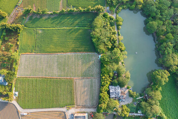 Aerial View of Farmland with Crops and a Pond in Rural Landscape
