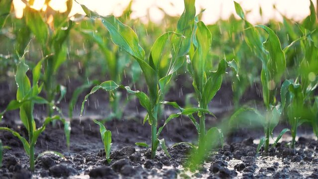 Agriculture. Corn field in water. Watering green plantation. Irrigation system for corn field. Rain irrigates green field of corn. Puddles on corn farm. Water on green plant.Farm irrigation management