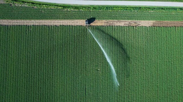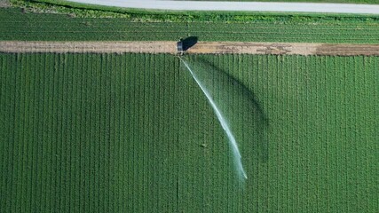 Irrigation system watering crops on agricultural field, aerial view