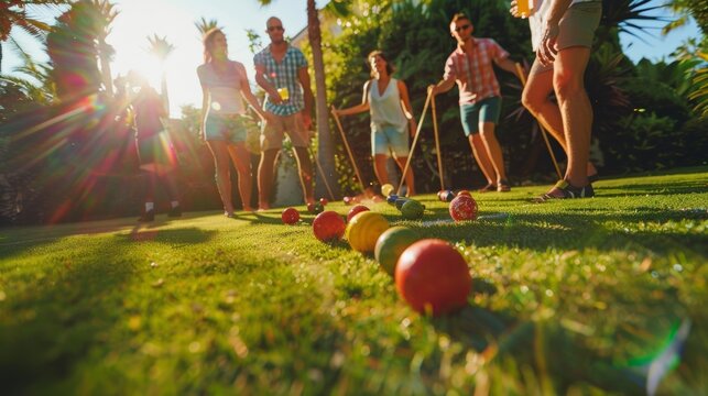 A group of friends playing a lively game of croquet on the perfectly manicured lawn glasses of mocktails in hand.