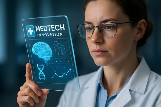 An innovative woman doctor wearing eyeglasses and a lab coat looks thoughtfully at a futuristic transparent device displaying the words "Medtech innovation," a medical cross.