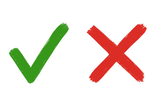 Green tick check mark and red cross X icon. Hand drawn brush paint style. Yes and no symbol. Correct, incorrect sign. Approval, rejection concept. Vector illustration.