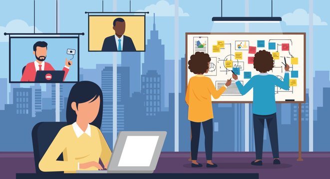 Modern professionals collaborate in a dynamic hybrid work environment, blending virtual video conferences with in-person strategic brainstorming and teamwork.