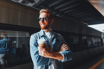 Waist up portrait of handsome bearded gentleman with crossed arms holding cup of coffee while looking away and smiling. Train on background