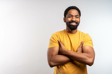 African American male doctor wearing white coat, standing with his arms crossed and looking confidently aside at copy space. Man posing against white background, symbolizing professionalism