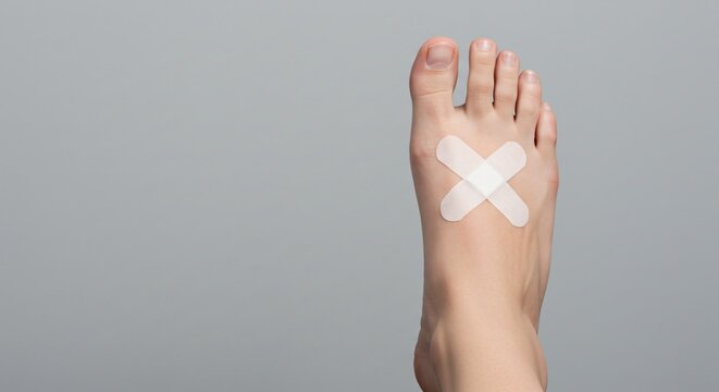 A caucasian woman's foot with two crossed beige adhesive bandages on the top. Foot injury and wound protection concept.