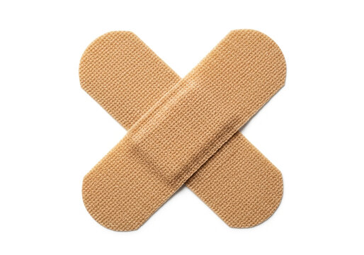 Two light beige adhesive bandages crossed in an X shape over a white background
