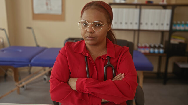 Woman with stethoscope and arms crossed at white desk in building office gazing at camera; rejection.