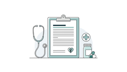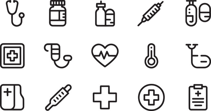 Medical outline icons featuring a stethoscope, heart monitor, thermometer, and prescription bottles are displayed against a white background for healthcare design.