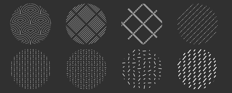 White seamless small dash pattern set. Abstract hipster geometric print. Simple black crosshatch repeat circle design. Linear tribal brush stroke wallpaper swatch. Diagonal endless stone doodle line.