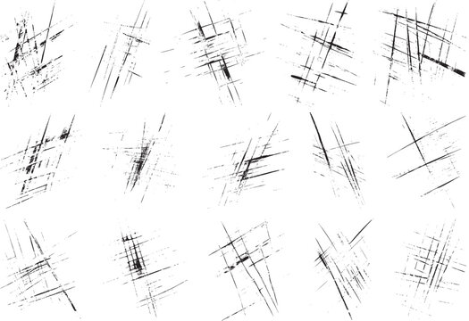 Set of grunge crosshatch texture vector brushes with distressed scratch effects, ideal for urban posters, vintage overlays, comic shading, worn illustrations, and edgy graphic design accents.