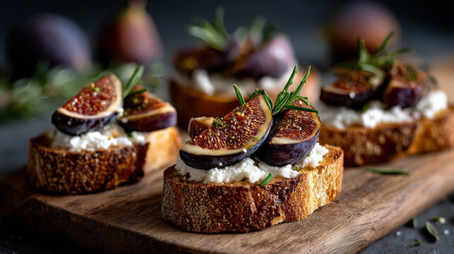 Delicious fig and cheese crostini appetizers with honey drizzle on a wooden board. Ideal for gourmet food presentation, rustic cuisine inspiration and autumnal menu promotion