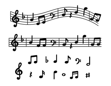 Music notation elements: notes (whole, half, quarter, eighth), clefs (treble, bass), accidentals (sharp, flat, natural), staff