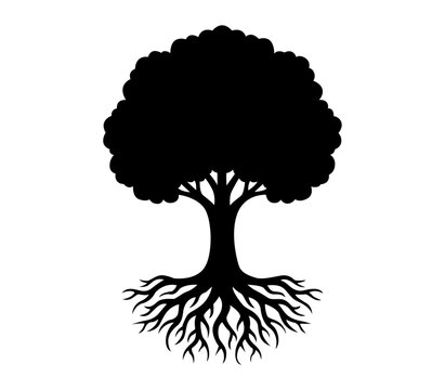 Árbol con raíces extendidas y copa frondosa en silueta negra