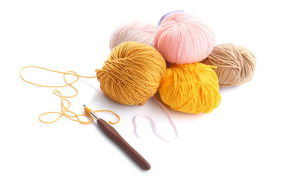 Colorful knitting yarn with crotchet on white background
