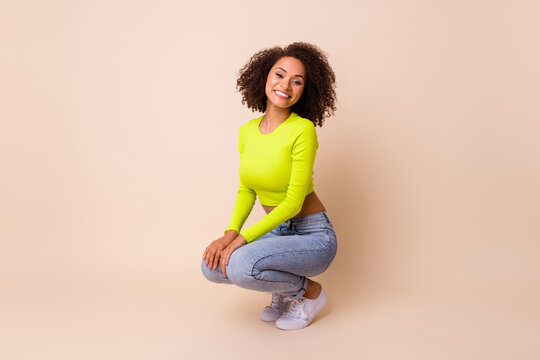 Full body photo of cute young lady curly hair squat crouch beaming smile dressed stylish yellow clothes isolated on beige color background