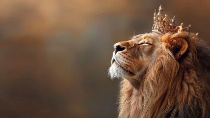 Dramatic image of a lion in a cape and crown illuminated by a spotlight.