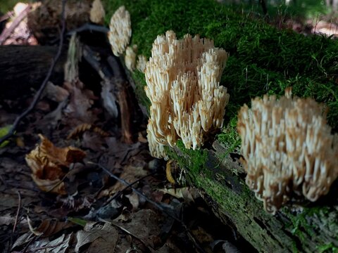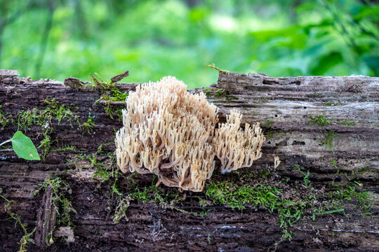 Beautiful woody edible deer antler mushrooms on the surface of an old tree in green bright forest moss growing in small groups. Fragile edible mushrooms of white color.