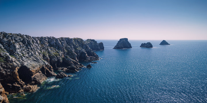 Panoramic in summer on the coast at Pen Hir Point on the Crozon Peninsula in French Brittany, the three famous islets, France