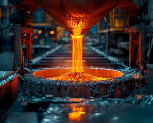 Molten metal cascades into crucible in industrial foundry. Liquid gold glows with intense heat, showing viscous flow of metal during manufacturing. Close-up detail captures power, energy of