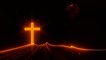 Christian cross crucifix on golden glowing mountain landscape