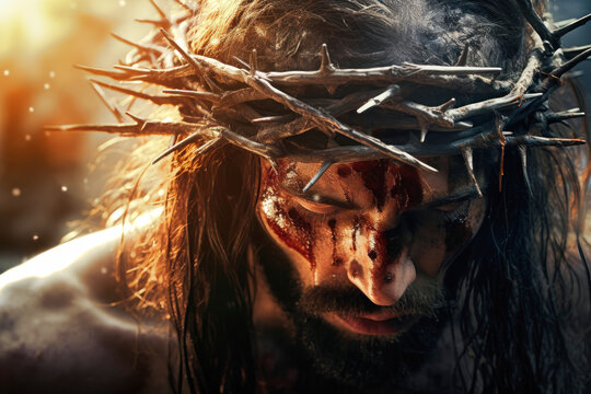 Jesus Christ wearing crown of thorns Passion and Resurection. jesus day holy,Easter card, Good Friday.thanksgivings, Generative AI.