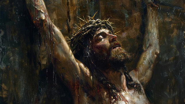 Oil painting of Jesus on the cross, with a crown of thorns.
