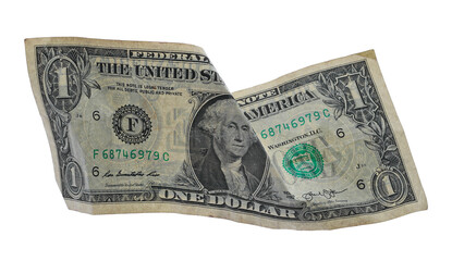 High angle view of crumpled scatterred US one dollar paper money cash bills isolated cutout on transparent