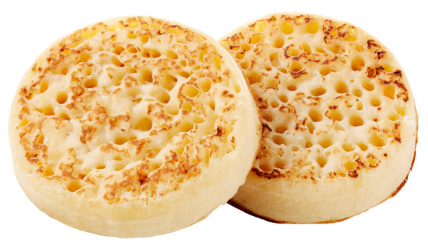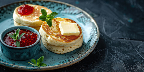 Hot toasted crumpets with a piece of butter on a plate with strawberry jam. Perfect delicious breakfast, popular in England, UK