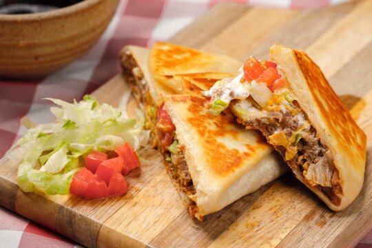A close up photo of a homemade crunch wrap taco on a cutting board.