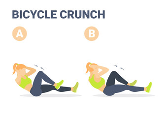 Girl doing Bicycle Criss cross Crunch Abs Exercise Colorful Concept illustration.
