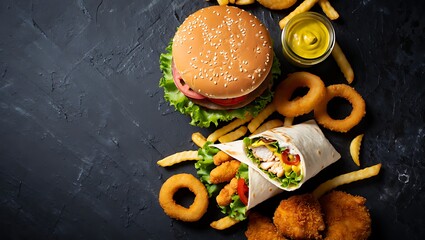 Overhead view of an appetizing fast food spread featuring a large burger, chicken wrap, golden fries, crunchy onion rings, and crispy nuggets on a dark textured surface.