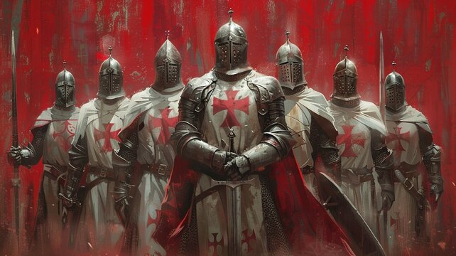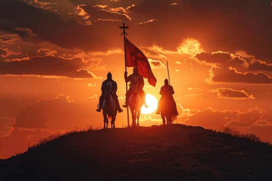 Group of crusaders in armor with shields and crosses at sunrise, evoking themes of historical battles, faith, and medieval warfare in a dramatic scene.