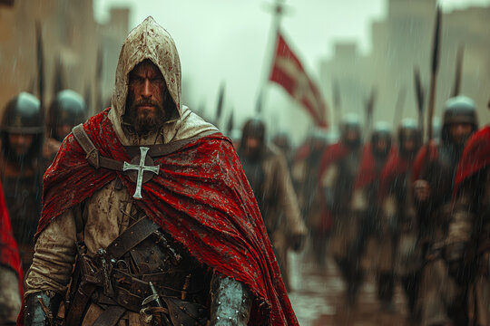 Templar knight wearing an armor with a red christian cross on it, medieval times with an army, castle village or town background, crusader hd