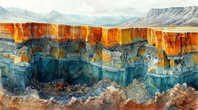 Cross-section of earth layers, showing distinct mineral strata, soil textures, and geological features