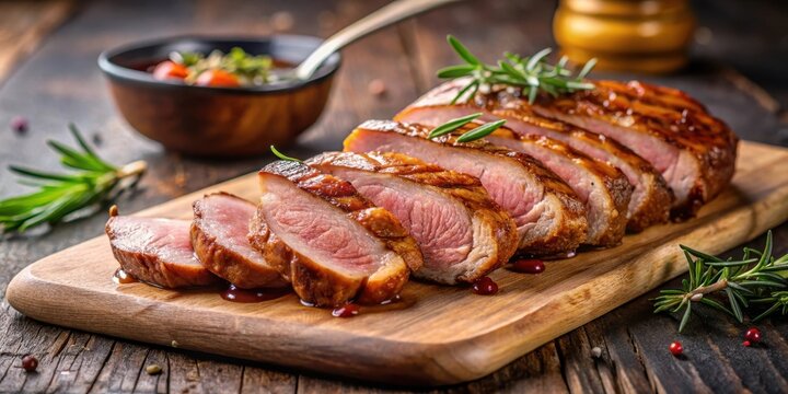 Juicy grilled duck breast sliced on a wooden cutting board with a subtle crust formation and savory juices dripping down